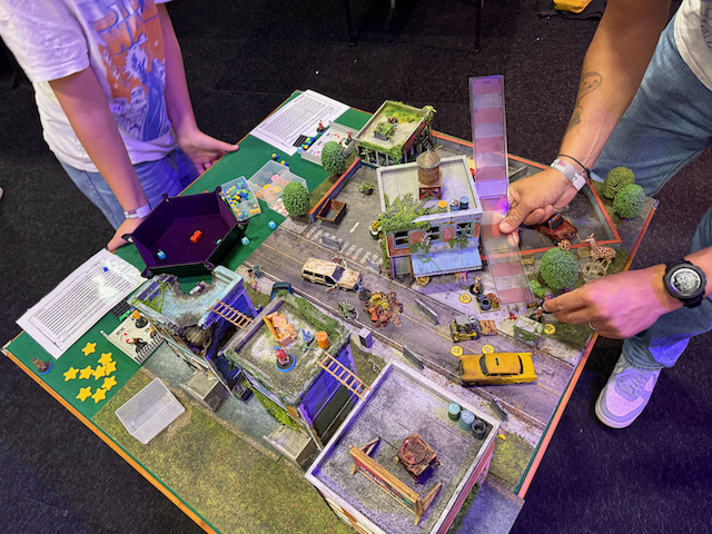 Malmö Game Week 2025 Ola, 2025-09-012025-09-01 En dag av samtal kring terrängbyggande, speldesign och en hel del speltestande. En ny versionen av de förenklade reglerna av MUTTS blev klar i tid till helgen och jag tänkte att nu är det så simpelt att minsta unge kan hantera reglerna. Så var det såklar inte! En stor insikt från MGW är att det är två helt olika saker att spela med okända människor i en oerhört brusig miljö och att spela med människor man känner i en lugn och sansad momgivning. Dels är såklart förväntningarna olika, i en demo-miljö vill folk komma igång med spelet inom ett par minuter och sedan ha en kort stunds action. Även om de förenklade reglerna av MUTTS är enkla så är de inte tillräckligt enkla för att lämpa sig för demospel i kaotisk miljö. Under de spel jag genomförde under MGW så valde jag bort flera regler för att trimma spelet till ett snabbare och mer dynamiskt spel. Flera av svårighetsslagen plockades bort, förflyttingin fick kosta 1HP per tum oavsett om det var klättring eller gå, skydd struntades i och hp-kostnader sänktes drastiskt. Jag funderade mycket över vad är kärnmekanikerna i MUTTS egentligen och vad är det jag verkligen vill behålla från Bonnie Blue framöver. Hanteringen av handlingspoäng genom en varierad handlingspöl och handlingsreserv är defintivt en mekanik jag gillar och vill behålla, reaktionerna och eldavbrotten likaså. Det jag ska ta en funderar på nu är hur handlingarna ska fungera framöver, främst balansen mellan hp-kostnad och svårighetsgrad – när är egentligen svårighetsslaget så relevant att det ska tillåtas sakta ner spelet och när är det bättre att bara låta handlingen kosta hp? Event